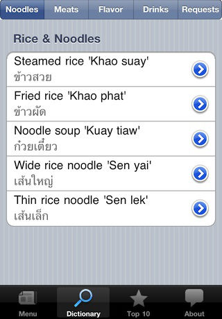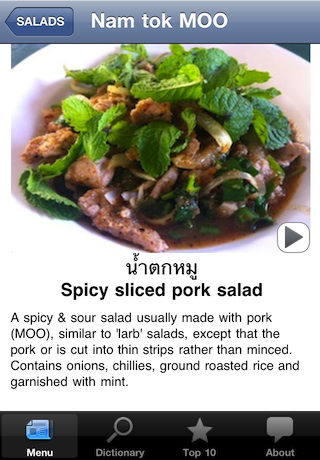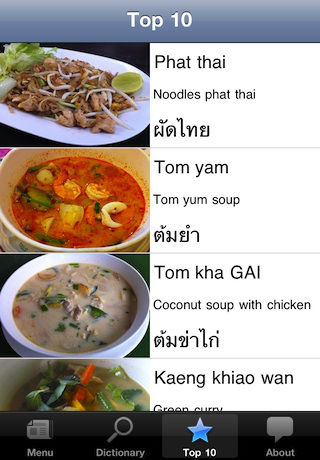 Designed for lovers of Thai Food, particularly for those travelling or living in Thailand. Learn how to correctly pronounce your favourite dish in Thai & learn more about the incredible variety of authentic & delicious Thai cuisine. ** NOTE: This free 'Lite' version contains only 4 entries per category. v1.2 of the Paid version now includes over 130 dishes and additional categories. If you like this app, please consider purchasing the paid version to support future development. You will be able to confidently order from non tourist restaurants that don't have an english menu or any english speaking staff. Order a meal yourself in Thai, show the waiter the photo & name in Thai script, or play the audio.. no more confusion. Detailed dish descriptions make this a useful reference when reading any Thai menu. Although designed primarily for those travelling Thailand this application is also great fun & practical to use at your favourite Thai restaurant at home. You'll discover that many Thai restaurants are more than happy to prepare authentic Thai dishes not listed on their standard menus. Features: - All entries contain English, Thai script, English transcription and audio of correct Thai pronunciation - Autthentic Thai Dishes grouped into a Menu of 7 categories (Salads, Soups, Curries, Noodles, Rice, Stir Fried, Deep Fried) - Audio food dictionary of individual words, drinks & common requests (No Ice, Not spicy etc) - Handy 'Top 10' list of popular dishes - Helpful notes & tips regarding Thai translation to English Each Detailed Dish screen contains: - Name in Thai script - Spoken audio of Thai name - English name - Transcribed english name - Description of dish - Photograph of dish New dishes added regularly in paid version. Planned updates will include Street Food, Snacks & Dessert categories Refer to the Support page for a complete list of existing content in the Paid version. ** No internet connection is required Reviewed by Richard Barrow on www.enjoythaifood.com http://www.enjoythaifood.com/thai-food-blogs/ talking-hai-food-menu-for-iphone.html Feedback welcomed, email gkgraphics@live.com.au