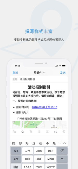 【QQ邮箱】全面支持邮件通用协议,协助在手机上管理你的所有邮箱。 【新】在手机上发送贺卡 【新】在设置中查询收信记录 【新】读信页面,截屏后快速标注 【新】高效便捷的邮箱通讯录 【新】外文邮件翻译为中文 多帐号 ·全面支持邮件通用协议,除QQ邮箱以外,还可添加多种其他邮箱 邮件收发 · 同步收取和管理多个邮箱里的所有邮件 · 新增广告邮件智能聚合 · QQ邮件订阅聚合及阅读体验优化 · 支持在线预览文档、图片、音视频、压缩包、eml等多种类型附件 邮件提醒 · 可选择仅提醒重要联系人的来信 · 为不同的邮箱帐号分别设置新邮件提醒开关 · 新增多种新邮件提醒音效 · 开启夜间免打扰…