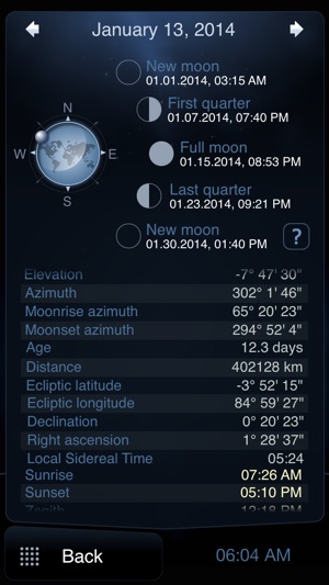 Deluxe Moon is focused on Moon science: from precise moon phase times and comprehensive list of lunar parameters to moon calendars and compass. Not only the application takes into account your location when computing moon parameters, but also it displays sunrise and sunset time and related sun infor…
