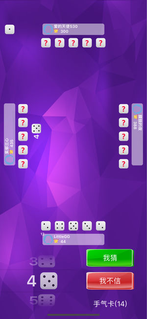 酒吧里最热门的游戏大话骰吹牛,免费休闲小游戏,朋友聚会,居家玩耍之神器 游戏规则 1.两个人先摇盅掷好骰子 2.双方轮流吹牛,猜两个人共同拥有的点数(比如4个6) 3.第一个猜的个数必须大于1,也就是不能猜1个Y,至少猜2个Y 4.后猜的必须大于前一个,从小到大为,2个1 < 2个2 < ... < 2个6 < 3个1 < 3个2 < ... < 10个6 5.当你不相信对方猜的点数的时候就可以一起开盅, 如果大家实际手上的牌点数大于等于叫出的个数, 那么不信的人就输了;反之,不信的人就赢了(比如当对方猜4个6时我不信,那么如果两个人盅里的6的个数大于等于4,那么我就输了) 6.点数1在上…