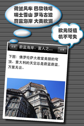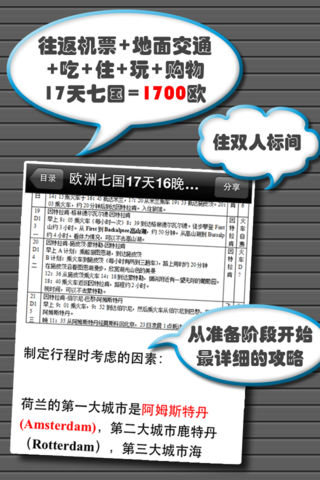 自助游欧洲17天,机票+地面交通+吃+住+玩+购物,每人只花1700欧!这是真的!看了这部《欧洲自助游全攻略》你也能办到! 去欧洲旅游必看《欧洲自助游全攻略》的五大理由: * 最详细,可复制的欧洲自助游攻略 * 帮助每位旅行者平均节省人民币5000元以上 * 提供交通,住宿,游览,吃饭,购物等全方位指导 * 获得新浪博客、走遍欧洲、搞趣网联合推荐,网络点击超1,000,000 * 对所有自助旅行都有帮助 《欧洲自助游全攻略》完全按照作者的亲身经历写成,对于欧洲旅行的各个方面都有详细记述,比如: * 如何买到便宜机票 * 如何预订欧洲旅店 * 如何制定行程 * 如何申请签证 * 省钱的地面交通解决方案 * 参观景点注意事项等等 《欧洲自助游全攻略》分为上下两篇。 * 上篇《旅行准备篇》主要介绍了欧洲自助游的准备工作应该如何完成。 * 下篇《行走欧洲篇》主要介绍了在欧洲旅游期间吃住行游的攻略秘籍。 现超值放送,上下篇合编,加量不加价!下篇内容陆续更新,精彩不断!