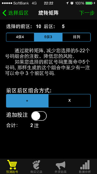 新版本已适配IOS 10。 祝贺日本彩民しゃぼん于12年3月19号使用我公司出品的ロト6プロ屋软件喜中1等奖,奖金额为217,597,800日元(约1700万人民币)。详情见产品博客。 Farmer Tech系列产品--双色球宝典Pro,工具畅销榜第二名 本软件是体彩超级大乐透的辅助工具, 集超级大乐透开奖数据分析、筛选、缩水, 历史开奖结果查询, 自行更新开奖号码, 自动兑奖等多种功能为一体的智能化彩票软件。软件原理基于“旋转矩阵”, 这一方法曾在美国造就了74位大奖得主, 是彩票业主流的预测缩水算法。本软件作者为日本LOTTO 6资深彩民, 已在美国、欧洲、日本彩票界帮助近百万彩民用户斩获颇丰。 ◆请注意:本软件不含推荐选号,仅提供4保4,5保3和排列缩水功能。4保4,5保3,4保4,4保3,3保3和推荐选号功能,遗漏值计算功能,仅在《大乐透Pro》里提供。 软件亮点: ■下一期中奖号码的预测. ■利用旋转矩阵算法帮助彩民缩水,减少垃圾投注。 ■最新中奖结果及中奖金额的更新等(数据在开奖日当天21:00分左右更新)。 ■购买记录管理,自动计算每期的中奖金额。 ■支持追加投注的奖金计算。 ■各种数据分析,分析结果均可通过邮件进行发送,发送的结果可以直接导入Excel,方便彩民的进一步分析。 ■预测结果邮件中,附件是淘宝下单用的上传文件,方便彩民进行网上投注。 ■支持模拟投注。可以利用我们的软件进行模拟投注,通过历史记录长期跟踪你的自选号码的中奖情况。 ■为了用户便于区分,软件采用了七种不同颜色来区分5红2蓝。 功能简介: 1、彩票号码的选择及购买列表的生成。 1)通过点击画面手动进行号码选择。 2)通过软件自动选择号码。 在高级版本产品《大乐透Pro》里,我们提供推荐选号的功能。通过对历史开奖结果进行分析和验证, 采用特殊的计算方法排序进行选择。 3)根据购买记录来选择号码。 4)根据数据统计信息表,通过自己的判断来选择预测号码。 5)利用旋转矩阵算法帮助彩民缩水,有2种缩水类型可供选择:4保4,5保3。 注:在高级版本产品《大乐透Pro》里,提供6种缩水类型可供选择。 5保4,5保3,4保4,4保3,3保3 缩水例:选择11个备选号码时,5/5:462注(原始组合)、5保4:22注、5保3:5注,个人推荐 5保4 或 5保3型缩水。 6)预测结果的保存及邮件的发送。 2 、购买记录的管理。 开奖后中奖金额的自动计算。 对购买次数、购买金额及中奖金额进行统计。 3、历史开奖结果查询。 4、数据统计 ◎ 期别出现次数顺序表 ◎ 期别出现次数表 ◎ 数字别出现的次数及顺序表 ◎ 低高和差数表 ◎ 奇偶数倾向表 ◎ 3、5、7、10、11、13分割倾向表示 注意事项 1、当历史开奖结果更新失败或是有错误数据发生时,请删除并重新更新。 2、如对本软件有任何宝贵意见和建议,欢迎您与FarmerTechs@Gmail.com联系! 售后QQ:2311079125。 3、本软件仅供使用者参考,因利用本应用程序购买彩票所带来的一切损失及其他后果均由使用者本人承担。