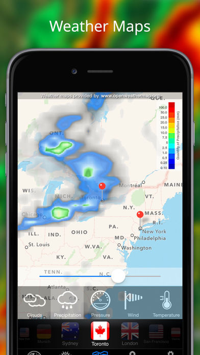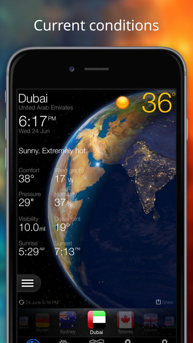 想像一下一切尽在掌握的感觉。从来没有哪一款软件能让获取天气信息变得如同“Weather Now”这般如此激动人心,更没有那一款软件的人机交互功能可以达到如此高的水平。软件中那些极其精美的3D地球图像会牢牢地抓住你的眼球,以至于让人忘记这款软件还有很多实用功能,这些功能可以用来获取精确的全球天气信息。 “Weather Now”的主要特色是其主界面和天气预报界面,其中天气预报界面有着一个独特的图表。在主界面中,你可以在选择地区后获取到一些相关信息,如当地时间,带有详细信息的天气信息,当然还有一个极其精美的3D地球图像,而这不仅仅只是个3D图像而已,它有着还原度非常高的大气云层图,甚至还有太阳和星星。你可以用手转动它,进行放大缩小操作,还可以让它自己慢慢旋转/静止。而当你将iPad放置在基座中时,这个软件还可以当作屏保老使用,绝对能吸引朋友们的目光。 天气预报信息是由CustomWeather提供的,这是一家来自美国的全球天气信息提供商,在该领域有着超过11年的经验。CustomWeather在技术和气象信息的革新方面都处于领先地位,并向世界各地的公司以及程序开发员提供气象信息。 当前天气信息是由数以千计的,经专人建造并维护的气象站采集得到的,这些气象站大多建造在各地机场中。Weather Now只显示在过去一小时内上报过当地天气信息的气象站所采集到的天气信息。当前天气信息每30分钟将更新一次,这几乎是大部分其他天气信息提供商所能达到的更新速度的2倍。而一个独特的,支持全球超过80000个地点的48小时天气预报系统,所能提供的信息详细程度与覆盖率,更是只有独此一家。 当前天气信息包括以下内容:描述信息,空气温度,风力及风向,湿度,露点温度,气压,能见度,根据当前天气情况而定的舒适度指数。 详细天气预报信息包括以下内容:描述信息,白天及夜晚空气温度,风力及风向,湿度,紫外线指数,降水概率,根据当前天气情况而定的舒适度指数。 特色功能: •可以方便的根据国旗在城市列表中选择不同的城市 •精美的3D主界面,带有高质量的实时地球图像,大气云层图像,以及太阳和星星的图像 •快速启动 •优化软件以适应iOS界面 •15日天气预报图表,带有每日详细天气信息,独立的白天及夜晚温度图表 •48小时天气预报图表,会根据实时相信天气信息变化 •提供超过80000个城市的天气信息,可以方便的查找各地信息
