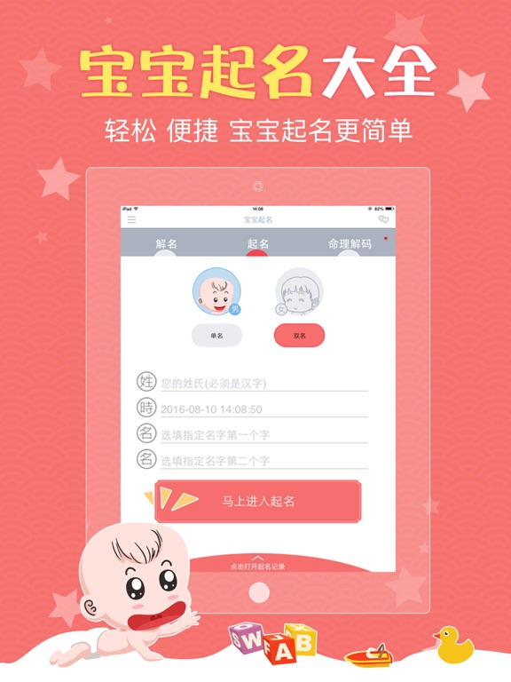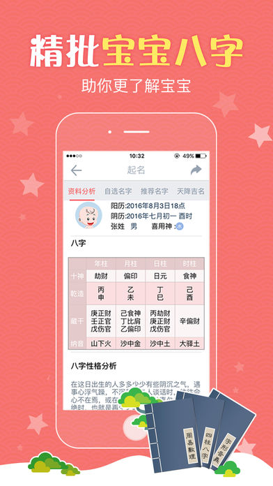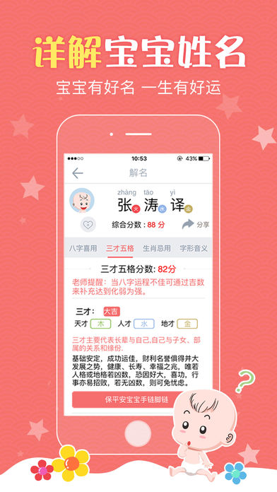 宝宝起名取名,给宝宝起一个好听又有内涵的名字。 宝宝起名取名,从人的八字出发,深度剖析八字中的信息,再结合人的性别、属相、汉字音律、意义、字形等方面,为你取得好名字。 【宝宝起名取名】特点: 1.起名方法继承传统八字、命理、周易起名学优点,准确判断名字好坏! 2.时间采用真太阳时,分析八字、紫微、命理信息更加准确! 3.专业生辰八字、三才五格、生肖喜忌、紫微排盘、字义音型分析,轻松读懂名字意义! 4.起名选择专业的命理、八字、周易、紫微方法,总有一个好名让您一生顺利! 5.更有每年紫微运程分析,让您找到正确方向,年年顺利不再是梦! 6.创新紫微排盘和姓名学结合,揭示你一生的命理运势!