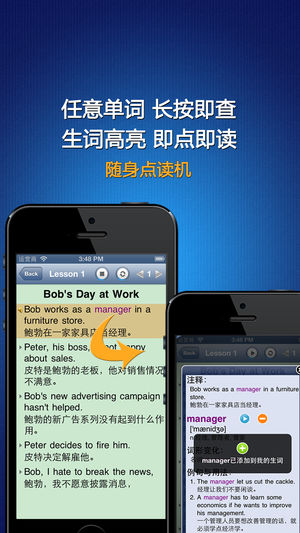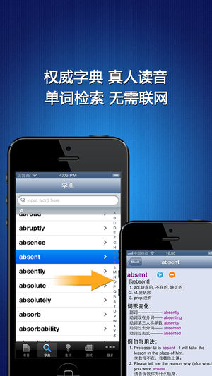 《英汉全文字典》具有强大的【点读】【点译】功能,对文中【每个单词】,真正做到了【哪里不懂点哪里】,是学习英语的必备利器。 √√标准发音+英汉对照+有声全文字典+点读机 《英汉全文字典》的每个句子都有标准的真人读音, 英汉对照, 即点即读. 文中每个英文单词都有详细的解释, 音标, 发音以及例句用法, 在阅读的时候只需在任意单词上长按超过一秒钟, 即可查阅, 即点即译, 真正做到哪里不懂点哪里. 新增单词检索功能, 无需联网, 离线查词, 方便实用. √√强大的学习功能 《英汉全文字典》提供了【生词】【收藏】【字典】【单词测试】【单词拼写】等附加功能, 可以将文中任意单词加入到【生词】, 生…