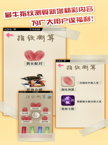 神准~!【指纹扫描】能测算流年运势、情侣对配!! 世界上最热门的指纹扫描应用,利用2013年最新的指纹检测技术,简单快捷又准确,可以快速检测您的指纹状况,为您分析性格、感情,还可以检测出你的另外一半。 上帝之所以创造指纹,是因为他想让人们知道,其实每个人都有伤痕。每个人的性格特点不一样,所经历的都不一样,所以每个人的指纹都是独一无二,终生不变。【指纹扫描测算】是一款很新颖、有趣的测算应用,手指的扫描过程还有大家熟悉的扫描声音,特有感觉。测算后,分析结果很神奇,精准~!你想知道你的是一个怎么样的人吗?你又想知道你和你的Ta是否配对,通过你的指纹便可知道,赶紧来玩玩吧! 点击打开应用,选择单人测算或男女配对;单人测算:选择您的手指,并将对应的手指放在扫描区域,应用会智能识别您的指纹,进行分析;男女配对:根据男左女右,将手指放在相应的扫描区域,应用会自动扫描分析,得出配对结果。查看结果后,还能分享结果哦~!