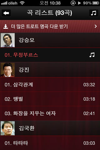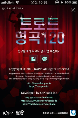 TROT K-pop 120 KAPP & Soribada.Inc selected 120 old K-pops loved by all ages. This is 2nd app. album made by hottest trot songs from ‘ Ddaengbeol by Kang Jin‘ that is good for driving at traffic jam in highway to ‘ Samogok by Tae Jin A ‘ that makes us feel pathetically. Most popular 50 trot singers as like [Kang Jin, Kim Do Hyang, Kim Su Hui, Kim Yang, Na Hun A, Nam Jin, Seol Un Do, Shong Dae Gwan, Yoon Su Il, Joo Hyeon Mi, Tae Jin A, Hyeon Suk, Hyeon Cheol, Hye Eun I etc..] join this album. TROT K-pop 120 will be always in our life because it can express Korean emotion better than any other. You can see more information on http://www.k-pop.or.kr Special Feature -. You can see lyrics & album information of all songs. -. You can see Images & information of all artists. -. You can share songs with your friends on facebook & Kakao talk. Notice -. You can listen by using this app only.