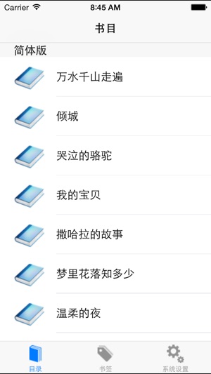 系統支援背景、字體大小、字體顏色設置,支援自動打開上一次閱讀畫面。 本書收錄了三毛作品集,共計13部的簡繁體: 萬水千山走遍 傾城 哭泣的駱駝 我的寶貝 撒哈拉的故事 夢裡花落知多少 溫柔的夜 滾滾紅塵電影劇本 稻草人手記 背影 鬧學記 隨想 雨季不再來 系统支持背景、字体大小、字体颜色设置,支持自动打开上一次阅读画面。 本书收录了三毛作品集,共计13部的简繁体: 万水千山走遍 倾城 哭泣的骆驼 我的宝贝 撒哈拉的故事 梦里花落知多少 温柔的夜…