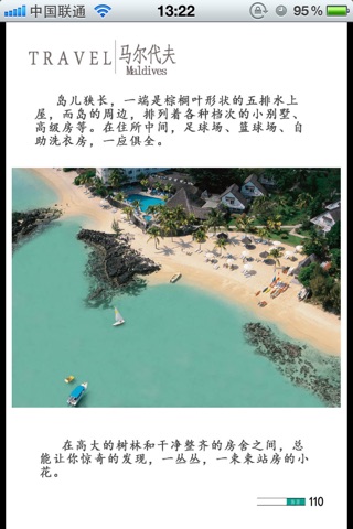 【内容简介】 此版本为史上最全的马尔代夫旅游景点资料。有人形容马尔代夫是上帝抖落的一串珍珠,也有人形容是一片碎玉,这两种形容都很贴切,白色沙滩的海岛就像一粒粒珍珠,而珍珠旁的海水就像是一片片的美玉。西方人喜欢称呼马尔代夫为“失落的天堂”,不过一个残酷的事实是,这一个被誉为“印度洋上人间最后的乐园的”的人间天堂——马尔代夫,在未来20年中,将放尽她无尽的魅力光华。在天堂失落前,让我们带您去⋯⋯ 99%晶莹剔透的海水+1%纯净洁白的沙滩=100%的马尔代夫。许多游客在领略过马尔代夫的蓝、白、绿三色后,都认为它是地球上最后的乐园。马尔代夫由北向南经过赤道纵列,形成了一条长长的礁岛群岛地带。一千多个岛屿都是因为古代海底火山爆发而造成,有的中央突起成为沙丘,有的中央下陷成环状珊瑚礁圈,点缀在绿蓝色的印度洋上,像一串串的宝石,海水清澄,煞是美丽。 整个马尔代夫的旅游景观全在一个度假岛屿与一个饭馆所经营的休闲气氛,因为每个岛屿都是一个独立的酒店经营商开发出来的,所以一岛一饭店就成了马尔代夫特有的旅游文化。 我们一直致力于提高内容的质量和实用性, 只为更好的满足您的需求, 如果您喜欢我们的产品, 请多支持我们, 为我们投上一票。如果您有什么意见或者建议, 请告诉我们, 我们会努力改进。再次谢谢您的支持和理解~ 【功能说明】 -全面支持iPhone/iPad/iPod Touch -全面支持蜂窝网络(gprs)/无线wifi连接 -保留传统单独下载功能,下载后便可离线流畅阅读。 -条状下载进程标识。 -卷列表未下载/已下载,明暗图标标识。 -自动记录最后阅读位置功能,配有书签标识。 -支持横竖屏自由旋转阅读。 -手势放大缩小功能。 -双击屏幕自动按比例放大缩小功能。 -产品内容自动更新(完结版除外) -反馈功能,任何问题均可发送给我们,督促我们成长。 【使用说明】 -手指从右至左划动-》下一页 -手指从左至右划动-》上一页 -双击屏幕任何位置-》按比例放大/缩小 -两根手指扩大捏合-》随意尺寸放大/缩小 -单指长按某卷封面-》删除该卷已下载内容 【请求帮助】 注:您好!感谢您关注我们的产品, 我们是一个在生死边缘艰苦创业的小团队, 您的评论对我们可谓至关重要, 如您觉得我们的产品做的还说的过去, 那么麻烦您给我们一个好的评分和评论, 如有任何意见和建议, 您可通过产品内的“反馈”功能鞭策我们, 我们会及时改正和优化, 尽力做出让您满意的优秀产品!非常感谢您的支持! 谢谢!
