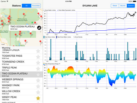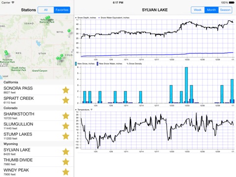 Snow Tell provides real time access to over 800 weather stations around the Western US, from the Snotel network. All stations include snow depth, density and temperature information. Number of stations: Alaska: 64 Arizona: 23 California: 33 Colorado: 115 Idaho: 85 Montana: 102 New Mexico: 28 Nevada: 55 Oregon: 82 South Dakota: 3 Utah: 112 Washington: 73 Wyoming: 90