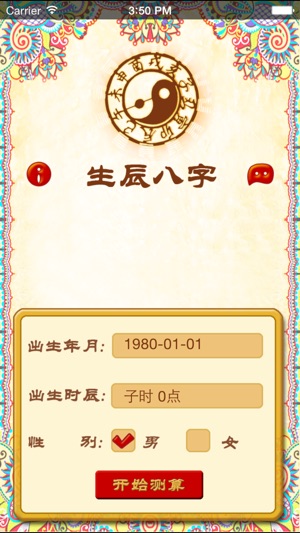 生辰八字,是周易术语四柱的另一种说法。四柱是指人出生的时间、即年、月、日、时。在人用天干和地支各出一字相配合分别来表示年、月、日、时,如甲子年、丙申月、辛丑日、壬寅时等,包含了一个人出生时的天体运行的基本状态。每柱两字,四柱共八字,所以算命又称“测八字”。依照天干、地支沂涵阴阳五行属性之相生、相克的关系,推测人的体咎祸福。 本算命系统来源于中国民俗学的一些测算方法,仅供休闲娱乐,请勿迷信。
