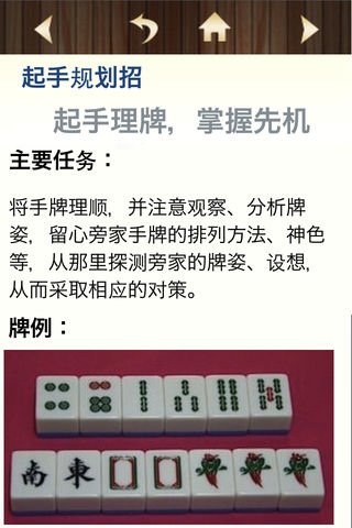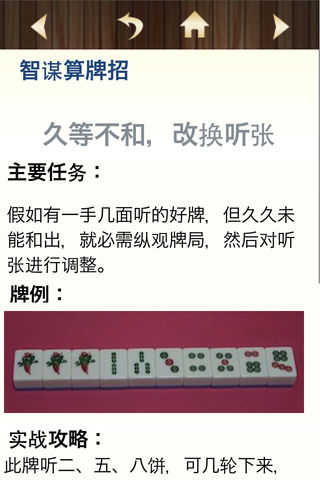 要想快速打得一手好麻将,[麻将终极制胜172招]是一个必备的工具,招招都来自于实战当中,并配以牌局的高清图片演示,绝对值得珍藏,随时参考。 软件特色: 高清牌局图片演示; 根据牌局选择对应的招数,并提供实战攻略参考; 按照打牌起牌,到拆牌,到做牌,到胡牌的逻辑顺序参考; 各类番种计算方法; 各地麻将特色打法速成; 界面设计精美简约,菜单式体验流程快速人性化(完全区别于图书的编排方式); 部分内容: 起手理牌,掌握先机; 面子调整,培养朋组; 分析牌情,以九定式; 分辨安危,避免放炮; 一路熟听,坐听一线; 引诱进张,和牌要领; 单钓风字,必钓尖张; 三喊碰牌,留一暗杠; 对付庄家,能克就克; 面对下家,吝啬为先; 巧吃偷张,有进有退; 吃二听三,出奇不意; 舍四胡七,引蛇出动; 勾引单钓,一九成和; 勾引边张,边搭成和; 狡诈对倒,完美收官; 129流行番种; 成都麻将打法速成; 北京麻将打法速成; 广东麻将打法速成; 上海麻将打法速成 台湾麻将打法速成; 武汉麻将打法速成; 哈尔饼麻将打法速成; 陕西麻将打法速成; 福建麻将打法速成;