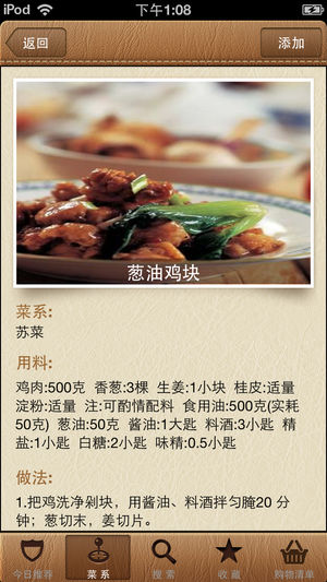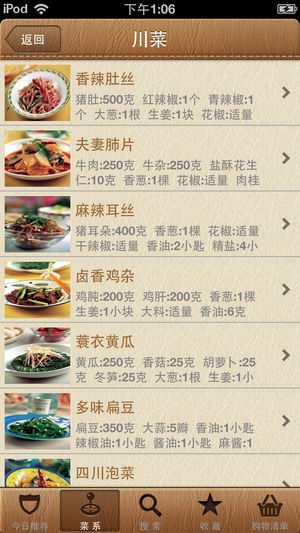 美食家收录了四大菜系,八大菜系中超过三千道的食谱,还特别收录的台湾小吃,日本料理,韩国料理的经典美食。您想吃的任何美食都可以自己动手解决。美食家内置的购物清单功能让您轻松逛超市。"我的作品"方便您记录自己做过的菜。所有菜谱都存在本地,即使没有网络也可以使用。精美的图形界面让您爱不释手,美食家将会是您手机里的舌尖中国。 【推荐】 每天精选6道菜,您不需动脑,就可以决定当天要尝试做的新菜。3个月后您就是名副其实的大厨了! 【菜系】 我们按照传统的四大菜系,八大菜系,家常菜,其他菜系为您提供了最全面完整的中华食谱。菜系分类:川菜,粤菜,鲁菜,苏菜,浙菜,闽菜,湘菜,徽菜,京菜,沪菜,晋菜,东北菜…