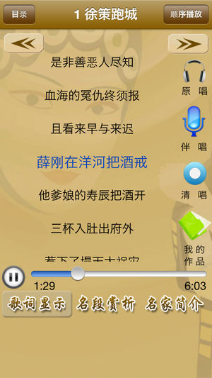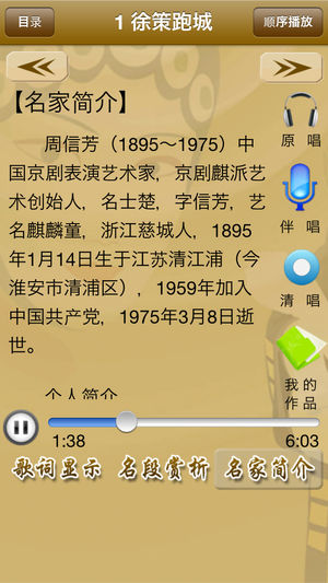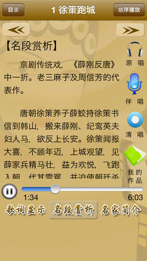 《京剧听唱》产品提供了118首由名家演唱的精彩的京剧名段,包含“原唱、清唱、我的作品”等功能,便于模仿和欣赏名家的演唱;原唱时,歌词同步显示;我的作品,便于用户管理自己演唱的京剧唱段;产品还配有京剧简介、京剧文化及名段曲目赏析。 《京剧听唱》产品,具体包含以下曲目。 徐策跑城(Xuce Run Aroud the City) 萧何月下追韩信(Xiaohe Chases Hanxin under the Moon) 四进士(Four Doctorates) 御果园(Royal Orchard)…