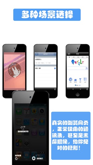 祝大家羊年快乐! 隐形摄像机,专业的偷拍利器,适合于非正常拍摄的各种场合: -博物馆中禁止拍摄,而您又不想错过分享的机会; -发现公车地铁的小偷,拍下他犯罪证据; -记者采访中的偷拍; -隐形的记录下别人的糗事; 隐形摄相机,让您在无形中完成这一切行动,别人只会看到您预设的屏幕,或是浏览网页,查看通讯录,甚至是黑屏拍摄。 功能介绍: 1、可供自由选择的隐形拍摄场景; 2、使用网页场景,在上网同时拍摄; 3、使用通讯录场景, 边查找联系人,边打电话发短信,边摄像; 4、使用黑屏场景,完全隐形拍摄,如同锁屏状态。 5、可以选择存储于应用内或者是系统相册; 6、强大的密码…