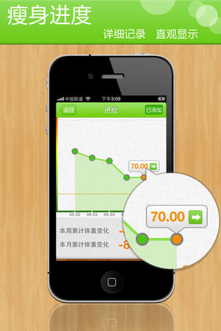瘦身日记是您的私家瘦身助理,我们旨在帮助您合理、健康、有效瘦身。 瘦身日记在免费期间,健康与健美区排名 ★★★★★中国区第一名★★★★★ ★★★★★香港区第一名★★★★★ ★★★★★台湾区第一名★★★★★ ★★★★★澳门区第一名★★★★★ ★★★★★中国区总榜Top15★★★★★ ★★★★★香港区总榜Top15★★★★★ ★瘦身日记★ 今天吃了什么东西,热量是多少? 今天运动了多长时间,消耗了多少热量? 春天到了,什么东西好吃又不长胖? 所有这一切,都可以在《瘦身日记》中找到答案!《瘦身日记》 是为您量身打造的健康瘦身、塑造完美身材的专业减肥软件。在记录您瘦身进度的同时,给予您最适宜的瘦身建议,为您提供最为专业的瘦身服务。 记录体重。记录每天的体重。 记录每天的饮食。早餐、午餐、晚餐、其他加餐等可以分别记录,一次输入、多次输入均可,当天的记录可以随时修改。 记录每天的运动时间及其消耗的热量。挑选适合自己的运动,并将运动的结果自动记录到日记中去。 记录每天的心情。记录瘦身旅程中,每天的心得体会,成为记忆中宝贵的财富。 ★运动健身★ 针对瘦身中的各种问题,提供多种可选择的运动方式,并推荐给您适宜的运动时间,运动完成后可以继续运动,外派,我们会对所有的运动进行运动时间和运动消耗热量的统计,将最终的运动结果,自动计入个人进度日记中。 ★进度统计★ 根据每天记录的体重值和日记,为您独家绘制出体重变化曲线,在上面可以查看瘦身过程中的体重变化,可以查看当天的体重和详细日记。 查看当前一周 和 当前一月的体重变化。 ★热量计算★ 我们为您提供了多个种类典型食物的热量,可以方便查看,添加按钮可以不断添加食物的数量方便计算,食物热量库也在不断地添加和完善,努力保证用户的食物可以查到。 可以添加多种食物进行热量计算,方便查看每日的饮食热量。 ★瘦身助手★ 为您提供各种减肥瘦身的方法,包含各种可以瘦身食物、容易发胖的食物、四季养生保健妙招,以及各种减肥瘦身的误区,内容丰富。 为您计算各种身体指数,精确把握瘦身进度和计划 ★分享功能★ 可以将您每天的进度 饮食、运动等分享到人人网、新浪微博、腾讯微博,与您的好友一起分享,瘦身中的点点滴滴。 ★精致的界面设计★ 专业的设计团队对软件的界面外观、用户体验都进行了精致的设计,尽最大的努力让用户感到满意。