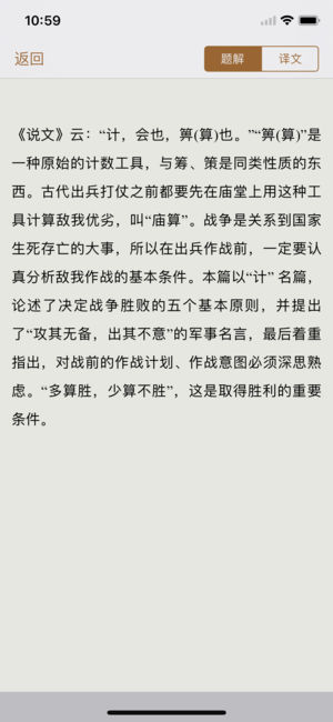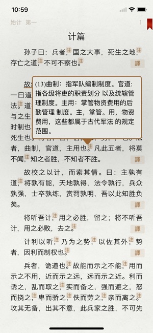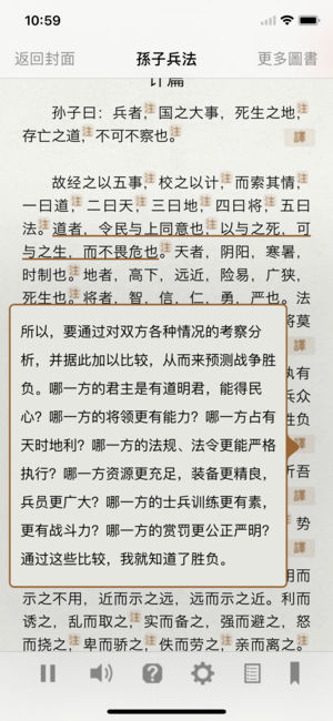 本应用为《孙子兵法》(The Art of War)有声同步版,可听可看, 名家诵读, 文字实时同步, 注释详细,注释与原文分离显示,支持点查,附译文, 以及字典。简繁切换,一书多用:可以聆听充满古韵的朗读;亦可字斟句酌地做为学习之用;亦可以快餐方式的查看译文,快速掌握《孙子兵法》的大意。适合各种人群,值得收藏! 有甚麽特色? 边听边看 正在朗读的文字用下划线标示 文字实时同步 手指双击句子即从指定位置开始朗读 注释详细,并与原文分离显示,支持“点查” 变速朗读 觉得读得快了或慢了都可以调节速度 附带字典 可以查询一些不认识的字词,包含古汉语字典,汉语字典,汉语词典,成语词典…
