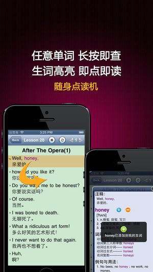 《社交英语》包含社交场合的各种场景对话,是工作交友、交际交流的必备工具。 √√标准发音+英汉对照+有声全文字典+点读机 《社交英语》的每个句子都有标准的真人读音, 英汉对照, 即点即读. 文中每个英文单词都有详细的解释, 音标, 发音以及例句用法, 在阅读的时候只需在任意单词上长按超过一秒钟, 即可查阅, 即点即译, 真正做到哪里不懂点哪里. √√强大的学习功能 《社交英语》提供了【生词】【收藏】【字典】【单词测试】【单词拼写】等附加功能, 可以将文中任意单词加入到【生词】, 生词在文中用【特别的颜色】标识, 把喜爱的课程加入到【收藏】, 对任意单词进行检索, 测试和拼写练习. 多种播放模…