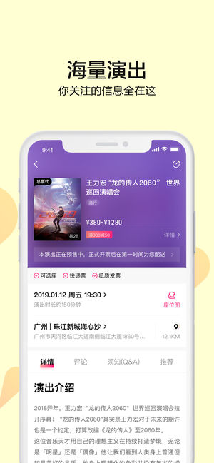 大麦网为华语地区领先的娱乐票务平台,为用户提供演唱会、话剧、体育比赛、儿童亲子、电影、展览等品类的选座购票服务,满足亿万观众走入演出现场的梦想。 【亮点推荐】 随时随地移动购票 红包折扣优惠不停 特色栏目粉丝福利 精编专栏撩妹必备 【爱•特色福利】低价折扣票、免费看演出、粉丝专属礼,一言不合就送送送!每天打开总有惊喜! 【看•有范频道】全新上线「发现」特区,麦小编每天更新演出资讯,为热爱现场的你精编各类养眼专栏,你要的潮、燥、闹、静、有态度的文娱生活,只需一个大麦APP! 【简•购票流程】优质的在线选座流程,支持同项目多票价多数量合并支付,便捷的电子票兑换,给你棒棒哒订票体验! 【…