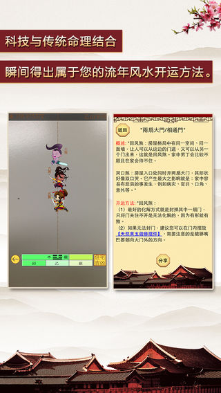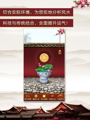 注:完整版无广告! App store最科技化的风水应用 风水实景罗盘为你详尽地讲解目前你的风水位置,让你更加了解你的前程未来。 采用2017年最新科技研发,利用精确的经纬度加上实景拍摄模拟,然后再专业地计算用户出生八字的开运方位,准确地计算出您的最佳开运位置。 风水实景罗盘特点: 1:科技与传统结合,全面祝你提升运气! 2:切合实际环境,为你实地分析风水! 3:摄像头功能,全方位分析辨别风水! 4:风水百科知识,助你成为风水达人 新功能介绍: [房间吉凶]:房间吉凶模式是解决住宅各房间布局风水上的问题。例如:大门向南,如果睡房在东方,受睡房影响主人会容易疲劳生病,对自己失去信息,需要使用这个功能调整睡房的风水,破除睡房的负面影响。 [流年方位]:流年方位模式是分析住宅中吉凶方位,调整流年风水影响。例如:今年东南方是文昌位,想要工作顺利,提升个人运势,就要调整东南方的风水。此外建议自建、改造住宅的朋友使用此功能去规划住宅。 [住宅平面图]:住宅平面图模式可以精准分析出住宅中每个位置的吉凶情况,想要生活美满就要善于利用住宅中的每个吉祥位置,该模式需要有一张住宅的平面图才能使用。 风水之学又叫堪舆之学,是我们中国流传下来的相地之术,中国风水学的形成由来已久源远流长,可以追溯到远古时代。风水的核心思想是人与大自然的和谐共存,了解自然环境,利用和改造自然,创造良好的居住环境。风水位置影响着一个人的身心状态,处在一个好的风水环境里,人的各种命理运程也会跟着改善。可是你知道一个人的生辰八字也会与他的环境风水有密切的联系么,不同命格的人适合不同的风水,好的风水都是相对其个人而言的。 当你的命格与你的风水现成相辅相成的最佳状态时,你不仅可以提升环境积极能量,还可以使人的思维清析,安神养性,保持和谐的精神状态。古代风水大师通过磁场感应,精心制作了风水罗盘来,给大家寻找最好的风水宝地,而如今时代发展,更加精细更加准确的罗盘诞生了,风水实景罗盘。 风水实景罗盘利用现在科技与传统风水理论相结合,通过不一般的方式来计算最适合你的风水位置。风水实景罗盘需要记录你的出生年月,然后与你的居家房子大门的所对位置纬度进行深入匹配,为你详尽地讲解目前你的风水位置。让你更加了解你的前程未来。