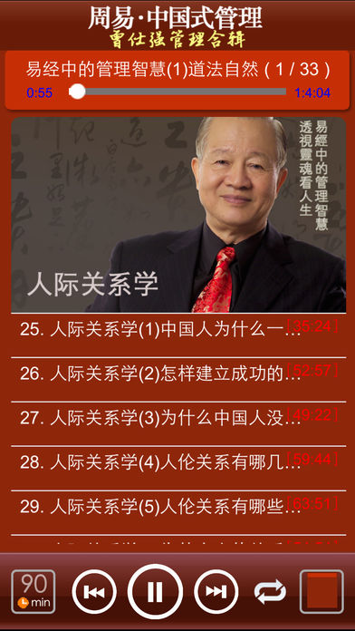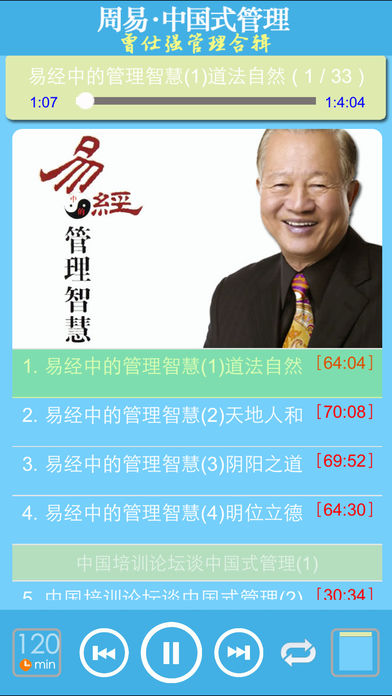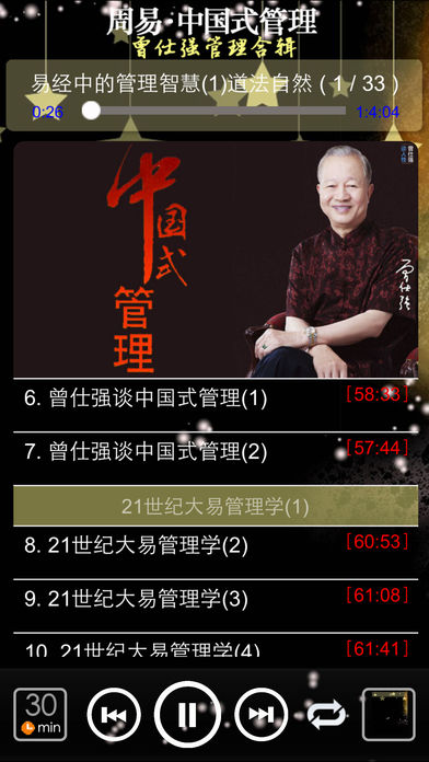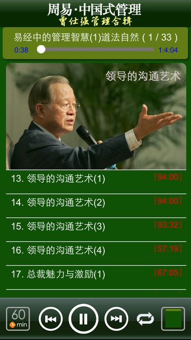 [有声]曾仕强:周易·中国式管理,中国人的必修课,强烈推荐。PR Player,我用心,你好用,创新为你。内容如下: ▪ 易经中的管理智慧▪ ▪ 中国式管理▪ ▪ 领导的沟通艺术▪ ▪ 总裁魅力与激励▪ ▪ 台湾老板特别班讲座▪ ▪ 人际关系学▪ ▪ 发挥潜能超越自我▪ PR Player ,Innovation for You,好用才是硬道理 ▪ 同时支持iPad,iPhone,针对屏幕大小单独设计 ▪ 数10款风格皮肤,选你所爱 ▪ 播放列表按照个人喜好排序 ▪ 支持专辑,强大的专辑管理功能 【目录】 ▪ 易经中的管理智慧▪ 易经中的管理智慧(1)道法自然 易经中的管理智慧(2)天地人和 易经中的管理智慧(3)阴阳之道 易经中的管理智慧(4)明位立德 21世纪大易管理学(1) 21世纪大易管理学(2) 21世纪大易管理学(3) 21世纪大易管理学(4) 21世纪大易管理学(5) 21世纪大易管理学(6) ▪ 中国式管理▪ 中国培训论坛谈中国式管理(1) 中国培训论坛谈中国式管理(2) 曾仕强谈中国式管理(1) 曾仕强谈中国式管理(2) ▪ 领导的沟通艺术▪ 领导的沟通艺术(1) 领导的沟通艺术(2) 领导的沟通艺术(3) 领导的沟通艺术(4) ▪ 总裁魅力与激励▪ 总裁魅力与激励(1) 总裁魅力与激励(2) ▪ 台湾老板特别班讲座▪ 台湾老板特别班讲座(1) 台湾老板特别班讲座(2) 台湾老板特别班讲座(3) 台湾老板特别班讲座(4) 台湾老板特别班讲座(5) 台湾老板特别班讲座(6) ▪ 人际关系学▪ 人际关系学(1)中国人为什么一切靠关系 人际关系学(2)怎样建立成功的关系 人际关系学(3)为什么中国人没有西方那样的人际关系 人际关系学(4)人伦关系有哪几个阶段 人际关系学(5)人伦关系有哪些经和权 人际关系学(6)为什么人伦关系要讲求艺术 人际关系学(7)现场问答(上) 人际关系学(8)现场问答(下) ▪ 发挥潜能超越自我▪