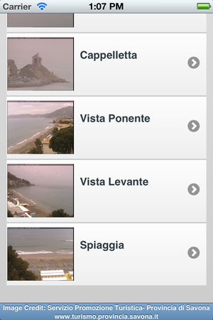 Che tempo fa in Riviera? Scoprilo guardando le immagini delle webcam della Provincia di Savona! L'applicazione permette di consultare comodamente le immagini delle seguenti località: Alassio, Andora, Celle Ligure, Ceriale, Loano, Pietra Ligure.