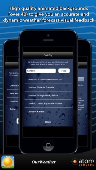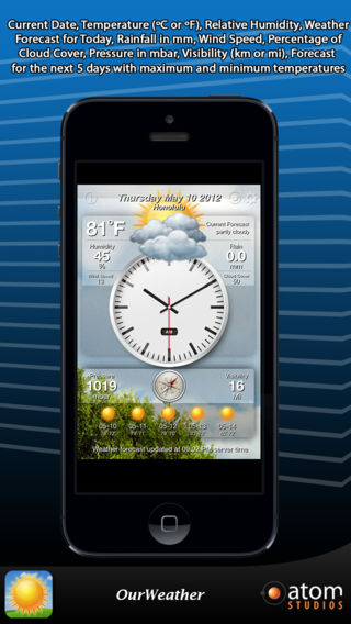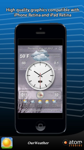 *** Featured by Apple as 'What's Hot' *** OurWeather for Mac is also available on the Mac AppStore! Welcome to OurWeather Do you want to know the weather forecast without having to look out the window? Do you want to have the most accurate and complete weather on the palm of your hand? With OurWeather now is possible! We have done for you what is probably the most beautiful weather app, and what is best, this is perhaps the most accurate of all existing ones. Other apps are focused on having lots of functions and settings. We thought it will be better to have an app that gives you everything with a single screen tap. Forget about configuring lots of settings. With OurWeather you will have everything you need in a simple and natural fashion. TECHNICAL FEATURES - Super accurate weather forecast - High quality graphics compatible with iPhone Retina and iPad Retina - High quality animated backgrounds (over 40) to give you an accurate and dynamic weather forecast visual feedback - Nothing to configure. OurWeather finds your position using GPS and gives you the weather where you are - Shows up to 10 different cities - Swipe your finger to change cities DATA DISPLAY - Current Date - Temperature (ºC or ºF) - Relative Humidity - Weather Forecast for Today - Rainfall in mm - Wind Speed - Percentage of Cloud Cover - Pressure in mbar - Visibility (kilometers or miles) - Forecast for the next 5 days with maximum and minimum temperatures - City Name SUPPORT Do you have some trouble? Do you need help? Do you have a awesome idea for this app? Please contact us. We are here to help! support@atomstudios.es www.atomstudios.es http://twitter.com/#!/Atom_Studios http://www.facebook.com/AtomStudios NOTES PLEASE NOTE: For using this app, you must have a GPS and compass equipped device, such as an iPhone 3GS or an iPhone 4. This application is NOT RECOMMENDED FOR IPOD TOUCH, NON-3G IPAD OR 1ST GENERATION IPHONE devices due to their limited hardware capabilities.