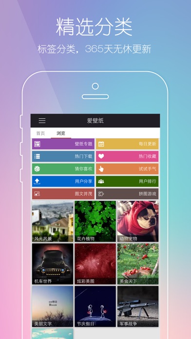 高清壁纸 + 权威媒体推荐 + 无广告干扰 = 专业 特别制作iOS 7专用壁纸,尊享超高清视觉盛宴。 [特点] 1.壁纸出新,专题精选,365天无休日。 2.分类清晰、标签准确,一目了然。 3.高清壁纸源,率先iOS 7视差预览。 4.标签索引、颜色筛选,快速锁定目标。 5.榜单排行、专题精选,走入最in潮流。 6.娱乐拼图,可爱壁纸带给您惊喜无限! 本应用提供风光风景、花卉植物、动物宠物、机车世界、炫彩美图、美食天下、美丽文字、节庆假日、军事战争、美图杂烩等壁纸分类,并且壁纸资源以每天200张以上的速度递增,请持续关注我们,新的 喜悦将连连不断…… 《爱壁纸HD》是我们用心制作的应用,同时支持手机、电脑,并请关注《爱壁纸HD iPad版》。我们重视您的每一条意见和建议,使《爱壁纸HD》成为最专业的壁纸应用!联系方式:info@lovebizhi.com