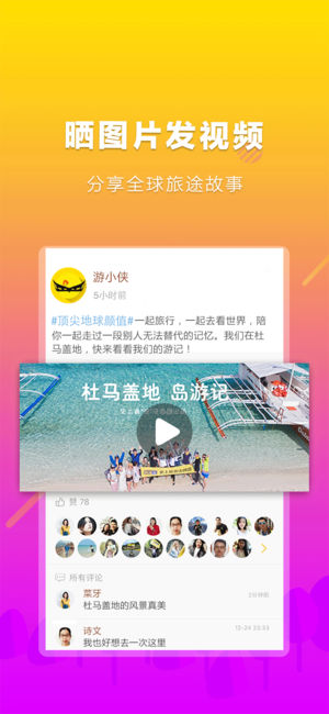 * 全球布局30分站,探索小众旅游线路,打造目的地深度旅游体验 * 资深旅游达人带队,纯玩无购物,确保旅游品质,好评率达99.7% * 注册用户突破500万,为旅行者打造约伴、游记、互动问答的专属社区 【海量原创线路】 - 随时随地预定周边游、国内游、出境游、摄影游、亲子游、自驾游、户外游、同城会、定制游; - 限时特惠全新上线,每月推出超值爆款限时秒杀,超值抢不停; - 一键预定跟团游服务,帮您省去订机票火车票、订酒店订门票、租车、签证、出国翻译的繁琐,让旅游体验更省心; 【遇见旅途分享】 - 开启游记新玩法,像微信朋友圈一样发布旅途中的所见所感,和会玩的人一起在这里分享旅行; - 遇见…