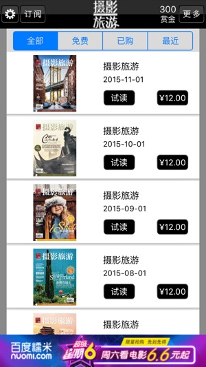 《摄影之友》杂志是国内影像媒体中发行量、覆盖率、实销率位居第一的品牌杂志,为了满足更多消费者的需求,2010年底,《摄影之友》杂志延展变为《摄影之友》和《摄影旅游》双刊。其中《摄影旅游》杂志倡导爱摄影、爱旅游的生活方式,将摄影大师、旅行玩家、户外探险、汽车旅行和拍摄之余的吃住玩进行跨界整合,融入实用攻略、一手实战指导和详实的行摄地图,使《摄影旅游》不同于一般的旅游杂志,成为国内第一本为热爱摄影和热爱旅游的人共同打造的专业行摄杂志。 关于本杂志订阅注意事项: 1、摄影旅游杂志为月刊,一个月一期 2、订阅杂志,您可以选择 .订阅三个月,价格5.99美元或40元人民币 .订阅六个月,价格7.99美…