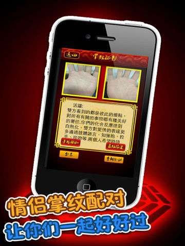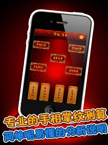 目前appstore最好的掌纹测算应用 被公認為appstore上最好的生活类应用 2013年最受欢迎的手相测算命理应用,采用最新技术照片扫描技术,为您分析最精准的个人性格,还有专业大师的开运推荐方法,让你简简单单开运一整年。 手相命理大师:有些事无法如自己所愿的进行,有很多愿望无法实现,可能是你掌纹还在沉睡哦,手相命理大师结合这三条掌纹基本线,就可以帮你算出你的性格和未来发展的前程了哦。 【手相命理大师】手掌里面,真的充满了许多真理。感情线,它的形状就是你的心的模样,可以看穿你的心,智慧线可以看出一个人的思考模式和才能,而生命线象征着你的人生路途和精力的旺盛度。 六大特点: 1.专业的大师指导,内容准确 2.操作简单,界面精美,字体清晰 3.测后支持微博、邮件分享,好友互动 4.使用过程轻松,趣味性强,随时随地进行测试。 5.这是一款最好的生活应用,手相命理大师! 6.最详尽的个人分析,详细分析你的性格特点。 手相真的很有趣!如果多了解手相的一二事,就可以看见多姿多彩的世界! 自己是什么样的人?要如何才能变得更好?我目前遇到的问题该怎么解决?这些问题的答案,只要看着手掌,绝大多数都可以找得到 。手掌里面,真的充满了许多真理。感情线,它的形状就是你的心的模样,可以看穿你的心,智慧线可以看出一个人的思考模式和才能,而生命线象征着你的人生路途和精力的旺盛度。结合这三条掌纹基本线,就可以帮你算出你的性格和未来发展的前程了哦。 微信灵机提供了各类精准运势测算、专业命理app免费下载、最新鲜命理资讯、大师亲算等多项服务。 想体验最受欢迎灵机命理馆的专业服务,您只需要在“微信”上通过搜索,找到我们。方式是: 1.添加朋友->查找微信公众帐号->输入“灵机”,确认搜索即可。 2.添加朋友->搜号码->输入“lingjimiaosuan”,确认关注即可。 算卦占卜灵接触:http://www.linghit.com