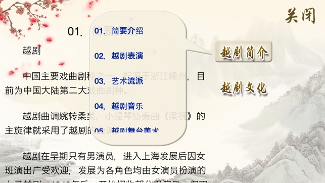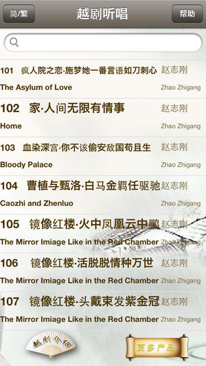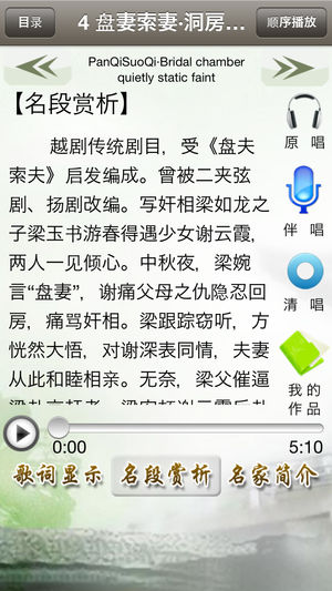 《越剧听唱》产品提供了100首由名家演唱的精彩的越剧名段,包含“原唱、伴奏、清唱、我的录音”等功能,便于模仿和欣赏名家的演唱;原唱、伴奏演唱时,歌词同步显示;我的录音,便于用户管理自己演唱的越剧唱段;产品还配有越剧简介、越剧文化、名家简介及名段曲目赏析;同时还增加了按需下载功能,方便用户选择所需的曲目。 《越剧听唱》产品,具体包含以下越剧名段。 汉文皇后•梦初醒 红楼梦•黛玉葬花 祥林嫂•听他一番辛酸话 盘妻索妻•洞房悄悄静幽幽 碧玉簪•三盖衣 浪荡子•十叹…