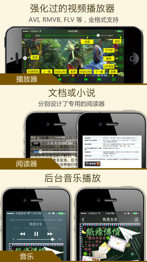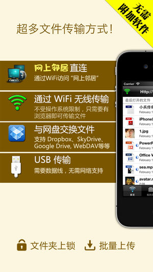 !!! 高级版首发,冰点促销一天,价格比普通版都要低的多哦!还不快抢! 『无线u盘 高级版』不但集成了『无线u盘』所有版本的所有功能,更具备了比如"网页下载"等独有的功能,而且是iPhone/iPad通用的版本 您是否在为您的手机不能自由传输文件而烦恼?您是否希望在您的手机上方便的查看您的文档和图片?您是否不希望您的某些文件被别人看到?您是否希望通过WIFI无线上传视频或音乐到您的手机?『无线u盘』可以帮您解决这些问题!它可以让您的手机变为一个文件管理器,并且您可以在手机中查看它们! 关键功能: - 多种传输方式!不但可以通过WiFi和USB传输文件,还可以与Dropbox,iDisk…