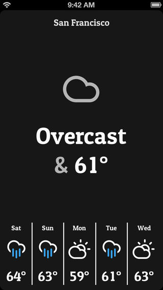 适用于iOS的条件简单,有趣和美丽的去检查的天气。 许多天气应用程序弄乱它们的接口和他们的用户超载的细节,是不是所有的有用吨。 条件只能说明你的最重要的信息是什么样子外,现在,无论你在哪里,在世界任何地方。 ===五天天气预报=== 条件显示一个简单的,5天的天气预报,它会像每天都到外面,包括温度。 ===只需简单=== 您可以轻松地点击屏幕任意切换到一个更简单的多,只是什么样子的外,现在面对的条件。 ===日与夜=== 条件第知道什么时候它是黑暗的,并会自动调整它的外观和感觉一天的时间相匹配。