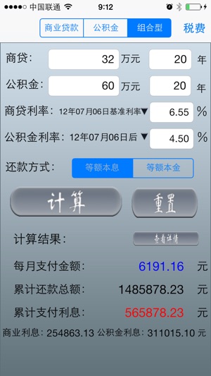 简介: 房贷计算器,是一个帮你计算房贷的小工具,比如:商业贷款,公积金贷款,组合贷款,税费计算 ... 主要功能: --- 全面地房贷计算功能 --- > 支持商业贷款 > 支持公积金贷款 > 支持商贷和公积金组合贷款 > 支持等额本息 > 支持等额本金 > 支持税费计算 --- 全面而权威的数据 --- > 支持最新的商贷利息数据 > 支持最新的公积金利息数据 --- 灵活自定义的的计算功能 --- > 支持自定义利息 > 支持商贷和公积金不同的贷款时间 > 支持自定义税费比例 > 支持月年计算,贴心 > 支持重置功能,快速 --- 简洁的界面风格 --- > 最精简突出重点数…