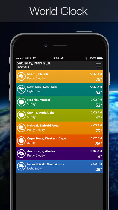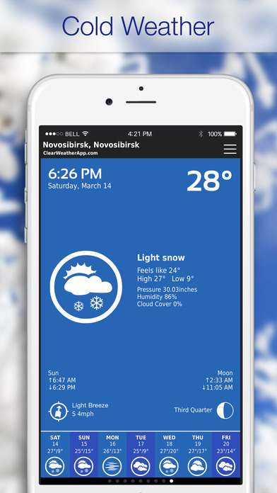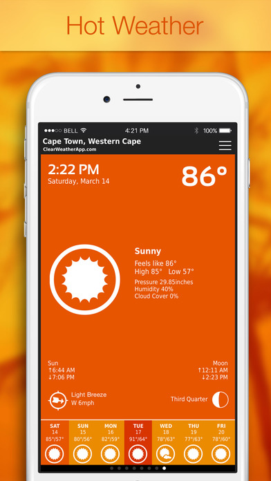 Get the feel of weather at a single glance! ClearWeather is the only app that shows you temperature by color so you don’t even need to read the forecast! Plus enjoy a clear and intuitive interface—just one swipe up or down for more details. • Elegant and clear interface • Current weather, 24-hour forecast, and 7-day forecast—all are easy to read, thanks to temperatures being displayed by color • Support for Celsius and Fahrenheit (as well as kph and mph for wind speed) • Displays local time with locations—no need to use two apps for weather and time • Weather forecast on the map (rotate the screen to show) • Forecast time line (rotate the screen to show) • All weather info you might need: Wind direction and speed info, humidity, precipitation, and pressure • Sunrise/Sunset, Moonrise/Moonset, and Moon phases info built-in • iPhone5 ready (takes full advantage of the new big screen) • Share your weather conditions on Facebook or Twitter ◆ Video: http://bit.ly/clearweather ◆ TIPS • Swipe horizontally to navigate between locations. • Swipe vertically to change between Current Weather, 24-hour forecast, and 7-day forecast • Swipe left on a location to delete it in the Locations screen • Long-press anywhere on the screen to show (or hide) the toolbar. ••• URL Scheme support ••• To launch ClearWeather application, use this URLs: clearweather: clearweather://today clearweather://forecast24h clearweather://forecast7d We are working hard on our next version! More features coming soon! Thanks for your patience! Please write to us before leaving negative reviews, as we can often help with your problem or help you better use this app. If you have any problems or suggestions please send a mail to apps@creativefingrs.com, you’ll get a response in a short time. Check out our other apps The Big Beet Fairytale – A painted fairytale for the youngest children Selfie Lock Screen – Bring your lock screen to life with selfies! Star Quotes – Every day you see another corner of the universe in 3D Star Collector – Collect as many stars as you can, before the countdown bar runs out! Please find us at: creativefingrs.com