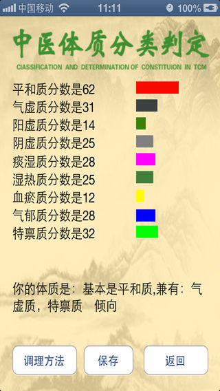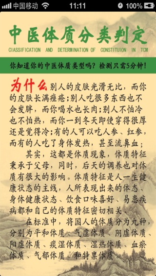 为什么别人吃很多东西也不会发胖,而你喝水也长肉? 为什么别人的皮肤光滑无比,而你的皮肤坑坑洼洼长痤疮? 为什么别人不怕冷也不怕热,而你一到冬天即使穿得很厚还是觉得冷? 为什么有的人可以吃人参、红参,而有的人吃了身体发热,甚至流鼻血; 其实,这都是体质现象,体质特征秉承于父母,同时,后天的调养也对体质有很大的影响。体质特征是人一生健康状态的主线,人所表现出来的体态、身体健康状态、饮食喜好、易患疾病都和自己的体质特征密切相关。 中华中医药学会发布并实施了《中医体质分类判定》标准。在标准中,将中国人的体质分为九种体质,分别为平和体质、气虚体质、阴虚体质、阳虚体质、痰湿体质、湿热体质、血瘀体质、气郁体质和特禀体质。每个人都应该了解自己的体质类型,要顺应自己的体质养生保健,防病治病,只有这样才能达到事半功倍的效果。 请根据近一年的体验和感觉,认真回答下面的问题,体质测试完毕后,你就知道你属于九种中医体质的哪一类。更可以知道适合自己的养生方法。 软件提供了体制的总体特征、形体、心理特点、易发病的倾向、对环境的适应能力、起居调摄、饮食调理等多项内容,是人们保健、养生、防病的必备软件。