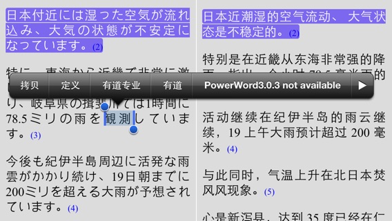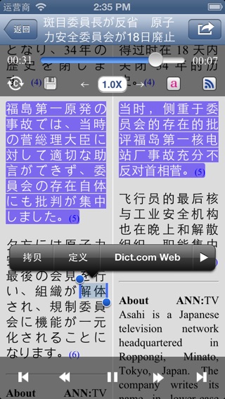 2013/03/23 进入韩国iPhone总榜前10名 (3月26日韩国总榜第一名) 2013/03/16 进入台湾iPhone总榜前10名 (3月18日台湾总榜第五名) 一次性收费,没有月费,永远免费更新! 实时日语新闻,同步语音文字! 了解日本的窗口,最好的日语听力! 友情提示: 这个软件*不是*日本朝日电视台的官方应用,遇到问题时请您和我们开发者联系。谢谢! 概要说明: 回想自己当年学习日语时,经常通过听日语新闻来了解日本。这样既增长了日语听力能力,也获得了很多书本上没有的新鲜信息。但是由于学习时间不是很长,虽然通过日语发音,能猜测一些单词的意思,可是总是有很多听不懂的地方。非常希望能找到该新闻的原文。 现在通过互联网,我们能够找到很多的日语新闻资料。于是很多人忙于寻找下载各种资料,再转换成mp3,放在iPhone,iPod等各种播放器里,再打印新闻的文字资料。然后呢,发现这些整理工作比学习日语的时间还要多! 作为RSS新闻接受器,这个App帮您解决了上面所有的工作。只要点击一下[更新]按钮,就会自动从日文Yahoo里下载ANN朝日电视新闻的最新新闻的语音和对应的文字,这样就基本上可以和日文Yahoo同步听读最新的日语新闻。 而且不要惊讶哦,这么便宜的一次性收费软件,只要日文Yahoo提供内容,就会一直为您提供新闻服务。至于里面的在线翻译,请您也不要惊讶它的水平,毕竟现在的智能翻译器(Microsoft Bing)还在努力学习中。 主要功能: * 支持AB段重复播放 * 在收听日语新闻的同时,阅读同步的文字新闻 * 同步表示日语文字的在线翻译。 * 自动下载当前的mp3文件,以及对应的文字新闻 * 支持各种字典的联动查询功能 * WiFi网环境下的全部下载功能 * 支持iPad的全屏模式显示(IPad版) * 支持横屏模式的显示 * 支持多曲的顺序播放 * 支持iOS4的后台播放功能 * 线控耳机的选曲功能(iOS4) * 表示未读项目数,总项目数 * 表示对应的新闻网页,而不用切换到浏览器 联系我们: 电子邮件 - iyannapp@gmail.com 如果您在使用过程中遇到任何问题,请提供我们以下信息,我们将尽快解决,以方便您的使用。 1. 您所在地的区域,比如中国,日本,或美国等等。 2. 您所使用的硬件,以及iOS的版本。 3. 您所使用的网络环境。 4. 具体的错误信息,或者您对软件的改善要求。 谢谢!