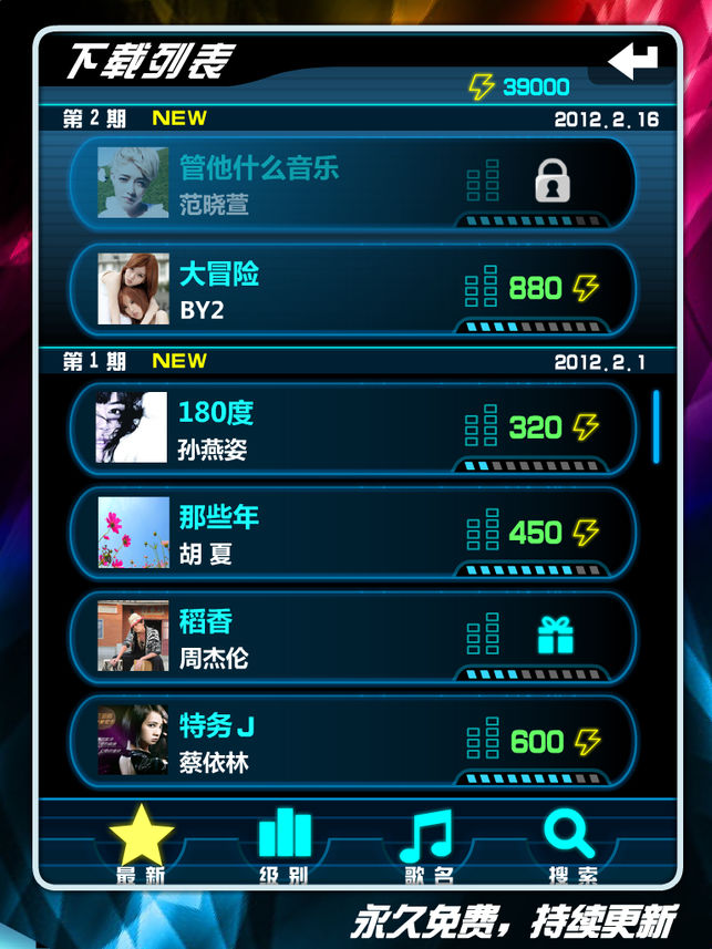 App Store华语第一音乐游戏首款iPad巨作上线! 华语第一手机音乐游戏, 永久免费, 定期更新! 《乐动达人2012》涵盖了华语乐坛包括周杰伦、孙燕姿、陈奕迅、蔡依林、罗志祥、梁静茹、SHE、张韶涵、吴克群、范玮琪、萧亚轩、潘玮柏、张震岳、FIR、苏- 打绿、周传雄、南拳妈妈、林宥嘉、BY2、黄立行在内的多位知名歌手的流行金曲, 同时还有贝多芬、赫吉克等著名音乐家的经典名曲。 ★★★★★最新更新歌曲: 第21期 --范玮琪《启程》 --罗志祥《爱疯头》 --杨培安《我相信》 --黑撒乐队《欢乐颂》 --孙燕姿《第一天》 --Bass Hunter《Jingle Bells》…