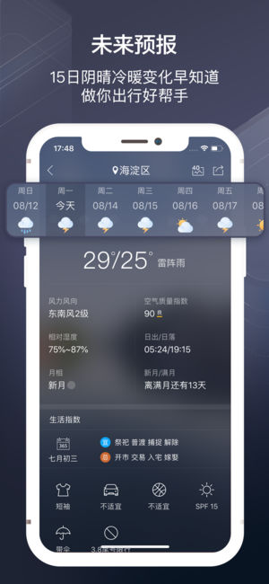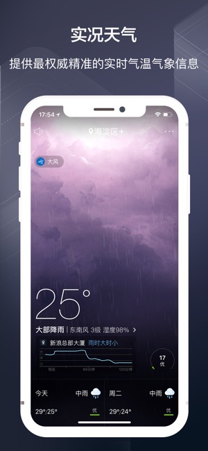 最专业最贴心的天气APP,3.8亿用户的选择,采用权威多数据源授权信息,智能纠错,国内3000多个城市与700多个景区全覆盖的天气预报和实时天气预警信息。各种天气状况从容应对,帮你做好生活决策,为你出行保驾护航。 【天气信息早知道】 分钟级预报:未来降水预报,精准到分钟级别。用户所在街道,每时每刻雨雪变化,尽在掌握; 逐小时预报:查看国内城市每小时天气预报、空气质量; 15日天气预报:长达15天预报,掌握更多天气信息,为出行早作计划; 天气预警提醒:实时天气预警信息第一时间掌握,由气象部门授权数据信息,精准涵盖市县区。 【污染指数见分晓】 空气质量——全方位涵盖2162个县市级空气质量预报…