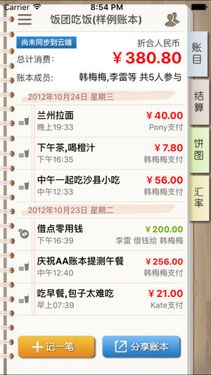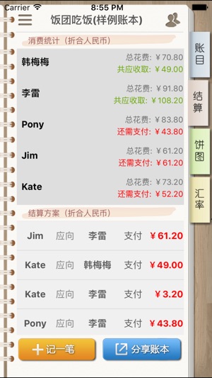 【 最简单好用的多人记账、结算和分享小工具!旅行、聚会、合租、同事饭团之必备神器〜】 AA账本——多人帐目,轻松结算! ************* 解决的问题 ************* 多人AA消费时,每个环节付款人不同、实际消费金额各异,帐目计算异常复杂: 【旅行】今天张三付了300元住宿费,明天李四付了600元门票钱,旅行结束时全忘了; 【聚会】李雷只参与了吃饭;韩梅梅只参与了K歌;按总额做除法不合理; 【合租】隔壁买灯泡花了20元,我修洗衣机花了200元,电费是小张帮忙交的,总不能直接做除法吧? 【同事饭团】悟空吃了5元的桃,八戒吃了45元羊腿,按人均25元AA,悟空不高兴!…