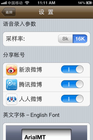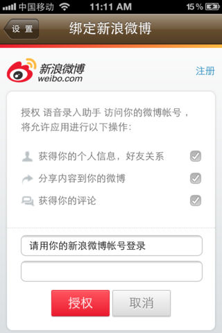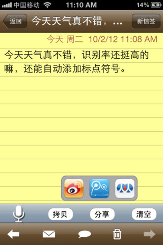 本应用实现了中文语音自动转换成文字的功能,同时集成了记事本、微博、邮件、短信等众多的功能模块,还可以通过剪贴板分享到任何需要大量文字录入的第三方软件或社交网站。 特征概述: 1. 支持新浪、腾讯和人人微博分享,支持微博字数计数提醒; 2. 完整的文字编辑环境; 3. 记录自动保存,自动取名; 4. 记录按日期和时间自动排列; 5. 强大的数据库搜索功能; 6. 翻页特效; 7. 邮件和短信功能,一键复制; 8. 多种英文字体; 9. 语音识别。
