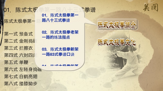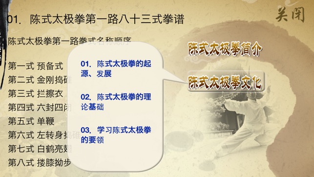 太极拳,是一种武术项目,也是体育运动和健身项目,在中国有着悠久的历史。陈式太极拳,原为陈家沟拳术,集长拳、炮拳及红拳之术,是目前各家太极拳的始祖。陈式太极拳的新架,包括一路和二路,其中一路83式,二路71式。本产品介绍了北京体育大学武术教练黄康辉老师的陈式太极拳传统套路第一路83式教学。 产品示范视频动作规范精准;教学采用完整示范演练与分段讲解教学、要点讲解相结合的方法,对每个动作要领进行详细的讲解示范;产品还配有陈式太极拳拳式文字说明,便于理解。 陈式太极拳83式视频示范主要包括以下部分: 01 基本动作 02 完整示范 整套演练…