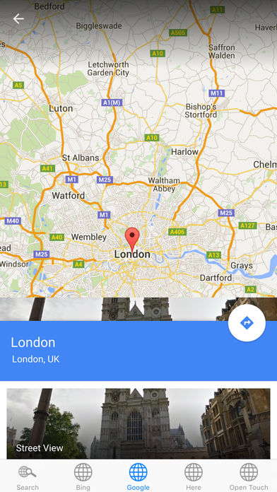 No map is perfect. Updates are rolled out to different maps all the time. Some maps have roads or places missing... With this app you can compare Maps from Bing, Google, Nokia and OpenTouchMap. This app allows you to switch between the 4 different mapping providers, using their online web apps.* Bing Maps is the mapping solution from Microsoft. In previous incarnations it has been known as MultiMap and MapPoint. Views include Bird's Eye and Aerial. Google Maps is the mapping solution from Google. Satellite, Traffic and Bicycling Views are available. The famous Street View is also available after you search for a location.^ Nokia Maps, or Here Maps as it is now called, uses NAVTEQ mapping data. Views include Satellite View, Public transport view and Live traffic view. OpenTouchMap is based upon OpenStreetMap, a community supported mapping implementation. Use your current location#, or search for a specific location. * Internet Connection Required # You must grant permission to the app, including the inner web-apps, allowing them to use your Current Location information. ^ To use StreetView, you must search for a location, then flick the screen up from the search result information. StreetView is only available in selected countries and areas.