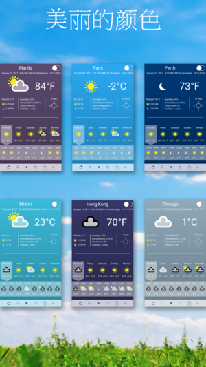显示全球多个城市的天气预报和当地时间 极为详尽的天气信息: - 14-天天气预报 - 今日最高温度与最低温度 - 风向与风速 - 湿度与降水信息 - 华氏/摄氏单位与英里/公里单位