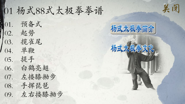 八十八式太极拳是1957年,国家体育部门组织一批太极拳专家整理出来的一套太极拳传统套路。它保留了杨式大架太极拳的基本结构风貌,具有中正自然,舒展大方,均匀连贯等特点。同时也规范了各地的一些不同练法。全套共88个动作,完整练习一遍,大约需要15分钟。 产品示范视频由著名太极拳名家李德印先生主讲,宗维洁女士分组示范。动作规范精准,教学方式直观有效,通过多层次演讲和讲解确保练习的准确性;教学采用对整套动作分段完整演练,分解教学和动作要点提示相结合的教学方式,使练习者直观领悟到太极拳法中手法、腿法等习练要领;产品还配有杨式太极拳相关简介和文化及八十八式太极拳拳式文字说明,便于理解。…