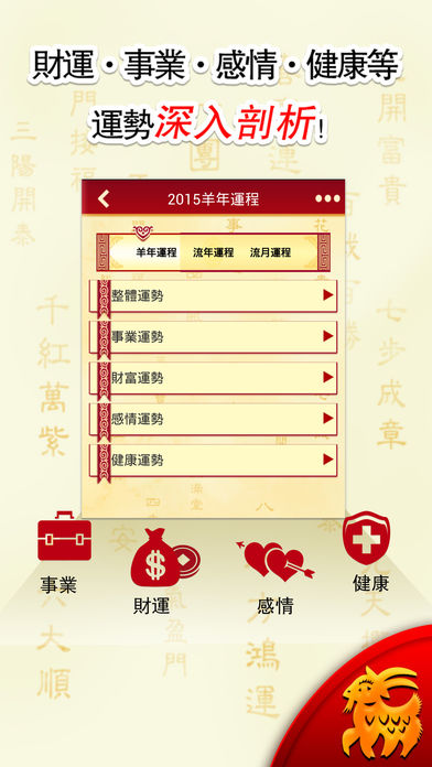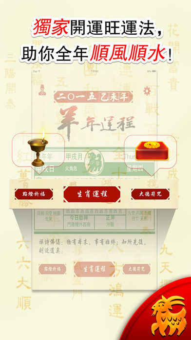 想全面掌握自己在新的一年运势凶吉吗?想知道自己和自己在乎的人在新的一年如何趋吉避凶吗?在担心自己新的一年打不开运吗?下载【2015年开运宝典】,抢先把我运势的机会! 【2015年开运宝典】由国内著名命理专家叶冬灵大师为你分析2015年羊年最精确的生肖运程命理,从事业、财运、感情、健康等多方面为你解析2015羊年整体运势。 【2015年开运宝典】同时为你提供开运宝符。多种开运宝符为你对症下药,全面开运。 特点: 大师分析预测。专业性,实用性,全面性无可挑剔。古今结合,解析运势。 界面精美,以中国古风工艺——生肖剪纸为主题,简约而尽显大方。 操作简便,趣味性、互动性强,随时随地朋友圈、微博分享。 独家化太岁方法,开运旺运一整年。 操作简便,趣味性、互动性强,随时随地微博分享。 微信灵机提供了各类精准运势测算、专业命理app免费下载、最新鲜命理资讯、大师亲算等多项服务。 想体验最受欢迎灵机命理馆的专业服务,您只需要在“微信”上通过搜索,找到我们。方式是: 1.添加朋友->查找微信公众帐号->输入“灵机”,确认搜索即可。 2.添加朋友->搜号码->输入“lingjimiaosuan”,确认关注即可。 算卦占卜灵接触:http://www.linghit.com