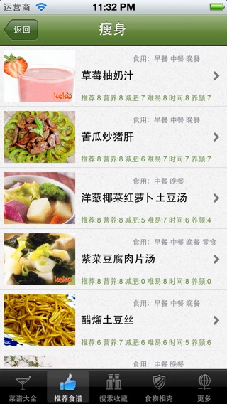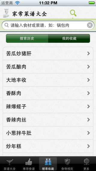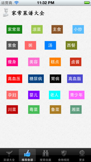 家常菜谱大全离线高速版本,无需网络,数据最全的菜谱应用,一旦拥有别无所求! 注意:安装包200M,请用wifi下载!!! 完美支持iphone5 4寸屏 家常菜谱大全家囊括了全国各地、各种口味、各种风情的最美味、最火爆、最受欢迎的家常菜谱、特色菜谱等菜谱大全, 通过这里的每一道菜谱你可以在家中尽情的做出属于自己的拿手好菜!, 菜谱收录2万6千多道家常菜、千余种食材、百余种菜系、多种食谱、粥、汤、面食以及268种食材食物相克大全等应有尽有! ★★★★食谱包括:★★★★ 解酒 防暑 感冒 咳喘 呕吐 失眠 腹泻 健忘 活血化瘀 阳痿早泄 乌发 美容 减肥 丰胸 补阳 滋阴 补气 补血 糖尿病等,以下是部分食谱列表: ◑脏腑调养调理◑ 心调养食谱(239)肝调养食谱(794)脾调养食谱(858)肺调养食谱(603)肾调养食谱(1009)补气食谱(880)补血食谱(1193)气血双补- 食谱(2887)哮喘食谱(90)感冒食谱(124)腹泻调理食谱(96)癫痫食谱(58)水肿食谱(717)便秘食谱(2392)失眠食谱(327).... ◑人群营养膳食◑ 孕妇食谱(493)乳母食谱(137)婴儿食谱(82)幼儿食谱(287)学龄前儿童食谱(209)学龄期儿童食谱(579)青少年食谱(1985)老人食谱- (1719)孕早期食谱(155)孕中期食谱(177)孕晚期食谱(116)4~5个月婴儿食谱(20).... ◑功能性调理膳食◑ 延缓衰老食谱(1029)消化不良食谱(827)神经衰弱食谱(410)乌发食谱(128)美容养颜食谱(1753)减肥瘦身食谱(1319)丰胸食谱(26- )补虚养身食谱(6156)补阳食谱(1358)滋阴食谱(2447)壮腰健肾食谱(1544)清热解毒食谱(1694)夜尿多食谱(113).... ◑世界各国食谱◑ 日本料理(5)韩国料理(16)越南料理(2)印尼料理(2)新加坡料理(1)泰国料理(4)马来料理(1)意大利菜(71)法国菜(66)德国菜(61)俄- 罗斯菜(1)美国菜(1)西班牙菜(3)墨西哥菜(2)朝鲜菜(2).... ◑疾病调理◑ 前列腺疾病食谱(32)糖尿病食谱(906)高血压食谱(1646)高脂血症食谱(1036)冠心病食谱(325)中风食谱(60)消化性溃疡食谱(58)肠- 炎食谱(37)防癌抗癌食谱(1744)胆石症食谱(23)脂肪肝食谱).... ★★★★菜系包括:★★★★ 粤菜(248)鲁菜(735)川菜(756)湘菜(720)闽菜(149)浙菜(196)苏菜(104)皖菜(69) 京菜(590)渝菜(3)豫菜(144)新菜(12)陕菜(58)津菜(8)清真菜(563)青菜(1)宁菜(2) 晋菜(134)赣菜(153)沪菜(582)琼菜(7)桂菜(4)甘菜(67)鄂菜(127)东北菜(166)滇黔菜(115) 少数民族菜(7)壮族菜(2)台湾菜(38)家常菜(4485)私家菜(6484)素斋菜(212)沿江菜(22) 沿淮菜(19)徐海菜(1)皖南菜(32)苏锡菜(20)绍兴菜(13)宁波菜(15)闽西菜(2)闽南菜(14) 苗族菜(2)孔府菜(6)金陵菜(26)胶东菜(20)济南菜(12)淮扬菜(28)杭州菜(63) 广州菜(111)福州菜(20)湘南菜.... ★★★★烹饪工艺包括:★★★★ 煮(5578)拌(2047)炒(1821)烧(1502)蒸(1277)其他(854)炖(826)原炖(801)烤(605)炸(557)焖(549)清- 蒸(487)生炒(471)烩(435)滑炒(411)红烧(371)卤(349)熟炒(324)煎(313)生煎(279)煨(266)扒(258)酱(253)炝- (242)碎屑料炸(240)溜(232)粉蒸(204)腌(191).... ★★★★口味包括:★★★★ 咸鲜味 原本味 清香味 甜味 酸甜味 炸烧味 香辣 咸甜味 本味咸鲜 微辣 五香味 酸辣味 甜咸味 酱香味 麻辣味 葱香味 蒜香味 酸咸味 椒麻味 奶汤咸鲜 糟香味 茄汁味 糖醋味 果汁味 咸酸味.... ★★★★原料包括:★★★★ 蔬菜类及制品 水果类及制品 谷物及制品 菌藻地衣类 干豆类及制品 乳类及制品 蛋类及制品 鱼虾蟹贝类 禽肉类及制品 畜肉类及制品 薯类、淀粉及制品 坚果种子类 速食食品 糖、蜜饯类 小吃、甜饼 饮料类 含酒精饮料 油脂类 药食两用食物 调味品类....