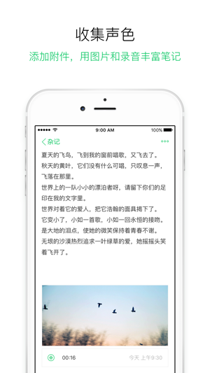 随笔记是简洁、清爽的笔记应用,曾获得豌豆荚「设计奖」。 你可以在iPhone、网页等平台保存课程笔记、捕获稍纵即逝的灵感、珍藏值得回味的记忆…随时随地记录生活点滴,笔记与生活同样多彩。 随笔记主要功能: - 安全快捷的云端同步,为你保护每一条笔记 - 丰富的笔记模式,用文本记录高光时刻,用清单整理待办事项或购物列表。添加照片和录音,让笔记有声有色 - 为笔记设置闹钟提醒,让每一个重要时刻如约而至 - 利用搜索快速定位笔记内容 - 创建笔记本,为每条笔记找到最合适的归属 生活的每个时刻都值得被记录, 那些感动、雀跃、奋斗、失落与领悟, 随笔记为你一一保留。 新浪微博:@GNotes 官方网…