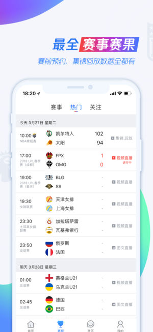 NBA全网独播就在腾讯体育! 腾讯体育,原名“看比赛”,是一款又好看又好玩,有最全的赛事直播、数据、视频,也有丰富社区互动、球星签名球衣、限量球鞋、NBA门票等大量奖品送给大家的APP。 好看,是因为腾讯体育覆盖了最全面的体育赛事直播资源:每赛季1200+场NBA比赛、中超、亚冠、英超、西甲、意甲、德甲、法甲、欧冠、欧洲杯、美洲杯、奥运、网球、NFL、健身、拳击、世界杯、F1、电子竞技、NHL……24小时经典比赛不间断!世界顶级的转播技术和团队,超清1080P蓝光清晰度、原汁原味英文原音解说、多视角、虚拟技术AR、前线采访,轻松满足球迷各种需求~ 好玩,是因为腾讯体育拥有柯凡、王猛、杨…